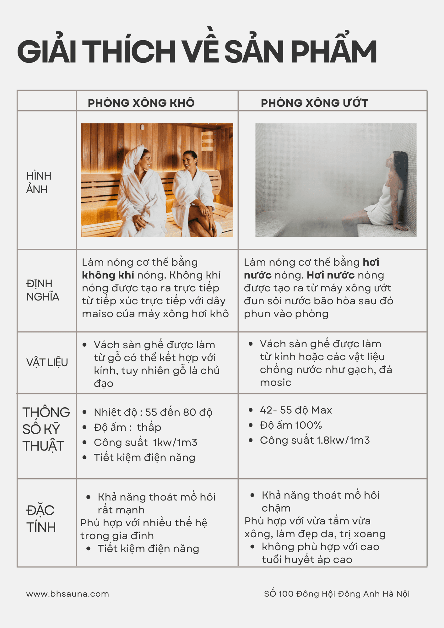 Có hai loại phòng xông hơi phổ biến hiện nay là phòng xông hơi khô và phòng xông hơi ướt, dưới đây là những đặc điểm và tác dụng của chúng để quý khách hàng có thể lựa chọn tùy vào nhu cầu của mình: